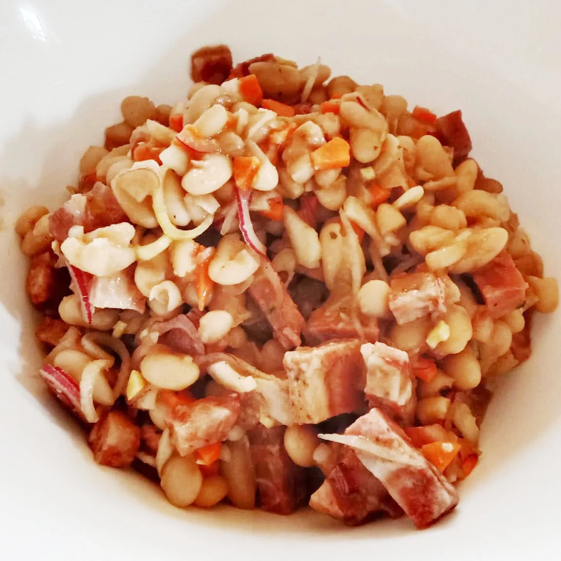 Un'insalata veloce da preparare; è la qualità degli ingredienti a fare la differenza. Olio extravergine di oliva, aceto balsamico corposo, fagioli della migliore varietà e la soprassata di Maiatoscana.